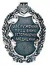 - Нагрудный знак к почётному званию «Заслуженный работник ветеринарной медицины Украины» имеет форму овального венка, образованного двумя ветвями лавровых листьев. Концы ветвей внизу обвиты лентой. В середине венка помещен фигурный картуш с надписью «Заслужений працівник ветеринарної медицини». Картуш венчает малый Государственный Герб Украины.