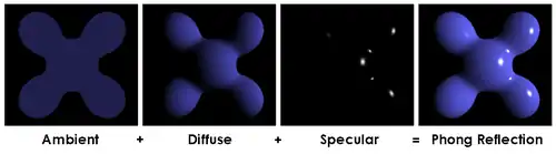 Расчёт освещения по Фонгу требует вычисления цветовой интенсивности трёх компонент освещения: фоновой (ambient), рассеянной (diffuse) и глянцевых бликов (specular). Фоновая компонента — грубое приближение лучей света, рассеянных соседними объектами и затем достигших заданной точки; остальные две компоненты имитируют рассеивание и отражение прямого излучения.