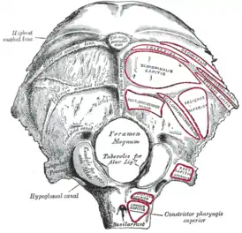 - Внутренний затылочный выступ — соответствует месту слияния венозных синусов;