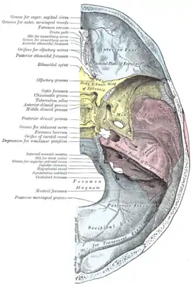 Рельеф внутренней поверхности обусловлен формой прилегающего к ней мозга и его оболочек.