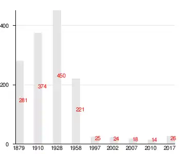 Число жителей по семейным спискам 1879 г.: 134 м. п., 147 ж. п.; по приходским сведениям 1879 г.: 130 м. п., 144 ж. п.[4]