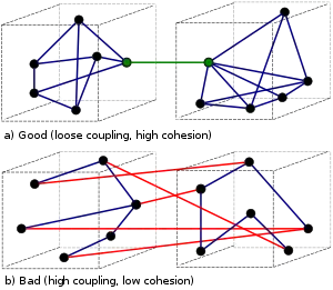 a) правильно (слабое зацепление, сильная связность), b) неправильно (сильное зацепление, слабая связность)