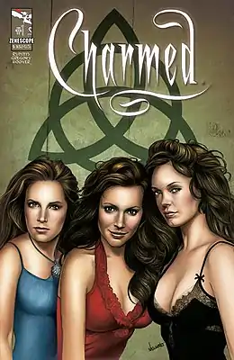 ![]() Обложка к комиксу «Зачарованные» 1-го выпуска. Основные персонажи. Слева направо: Пайпер, Фиби, Пейдж | |