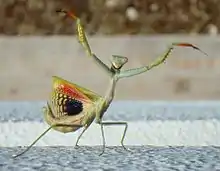 Многие животные, в том числе мотыльки, бабочки, богомолы, Phasmatidae и головоногие, используют приёмы угрожающего или отпугивающего поведения, например, демонстрацию «глазков», чтобы испугать или на мгновение отвлечь хищника и успеть спастись бегством[7][8][9].