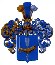 В лазоревом щите рука в золотых латах держит вверх серебряный меч с золотой рукояткой. Рука в локте пронзена серебряной стрелой остриём вниз.