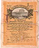 Облигация в 20 рублей III серии, лицевая сторона, с надпечаткой «Уездное Казначейство Яранск»