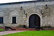 Укрепления замка состоят из казематированных валов с эскарпами высотой до 12 метров и толщиной до 23 метров, бастионов, одноярусной въездной башни и рва окружающего весь замок. Замок квадратный в плане, шириной 88 м. Пятигранные бастионы расположены по четырём его углам, в каждом из них были туннели, соединяющие их с казематами и замковым двором. Замок был одним из сильнейших, имел около 50 пушек на вооружении. Первоначальный проект замка предусматривал постройку 4-х угловых артиллерийских башен-бастей, соединенных крепостными стенами. Учитывая возросшую роль артиллерии, верх башен был снесен до уровня куртин, таким образом башни были превращены в бастионы, а изнутри по периметру двора к крепостным стенам были пристроены одноэтажные казематы, причем с отступом 12 м от внешних оборонительных стен, а промежуток между оборонительными стенами и казематами засыпан землей.