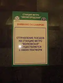 Плакат, сообщающий о том, что с обеих платформ поезда следуют до «Волковской»