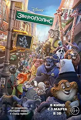 «Зверопо́лис» (англ. Zootopia) — американский компьютерно-анимационный комедийно-приключенческий фильм в формате 3D[10] производства Walt Disney Animation Studios, выпущенный Walt Disney Pictures. Это 55-й полнометражный мультфильм в серии Walt Disney Animated Classics. Слоган: «Добро пожаловать в городские джунгли».