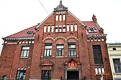 Фасад, обращённый к площади, украшен тремя треугольными фронтонами. Выходящий на проспект фасад является менее протяжённым, однако он украшен большим по размерам фронтоном с щипцовым завершением, выполненным из гранита; со стороны проспекта расположен главный вход в здание банка. Интересная черта фасада — терракотовый декор, редко встречающийся в зодчестве Финляндии. Примечательны сандрики над окнами первого этажа, украшенные горельефами, отражающими особенности выборгской истории и экономики. В каждом из них парные путти держат такие эмблемы, как гербы Торгильса Кнутссона, Выборгской губернии, эмблема Ганзы и др. Другими украшениями фронтонов служат многочисленные мелкие детали, в том числе короны и символы богатства — маски свиней, баранов и пастуха.
