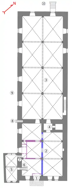Внутри здания изначально были расположены друг за другом двухнефные малый и большой, или главный, залы.