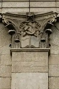 Над главным входом помещены барельефы, изображающие Маркса, Энгельса и Ленина. Ранее также присутствовал и Сталин. В навершиях пилястр имеются лепные раскрытые книги, на левой странице которых было написано — «Ленин», на правой странице — «Сталин». После развенчания культа личности Сталина его имя на книгах было замазано.