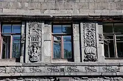 Несмотря на потерю многих декоративных элементов, имевших большое значение для зрительного восприятия фасада, здание и в наши дни привлекает внимание искусной резьбой по камню, включающей герб Великого княжества Финляндского, стилизованные жезлы Меркурия, а также символические изображения железнодорожного и морского транспорта, олицетворяющие Выборг как торгово-промышленный губернский центр. Кроме того, декор включает элементы карельской флоры и фауны: изображения сосны с шишками на ветвях, колосьев и рыбы. А основу растительного орнамента составляют вариации изображения чертополоха.