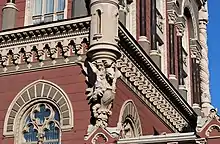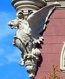 Монументальность здания подчёркивается широким карнизом, украшенным майоликой. Наружные стороны фасада закреплены витыми колонками с декоративными башнями, которые поддерживаются скульптурами величественных грифонов — крылатых львов, или полуорлов-полульвов. Интересно, что в античной мифологии грифоны считались хранителями золотых месторождений.