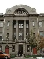 Фасад здания выполнен подчёркнуто строгим, фронтальным и симметричным. В центре фасада расположена портальная лоджия двумя колоннами большого ордера, за которой находится глубокая ниша фронтона. В боковых пилонах установлены колонны меньшего размера. В нишах фасада располагались ныне утраченные одиночные скульптуры и многофигурная композиция работы скульптора В. Фёдорова. Общий дизайн здания имеет некоторые элементы раннего модерна.