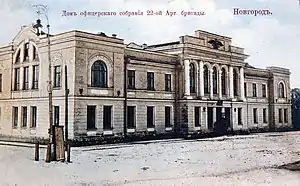 С 1865 года в Новгороде квартировала 22-я артиллерийская бригада. Управление бригады много лет добивалось выделения средств на строительство отдельного здания для офицерского собрания, так как до этого ему приходилось размещаться в съёмной квартире на Легощей улице. И лишь в 1910 году военное ведомство выделило необходимую на строительство сумму.
