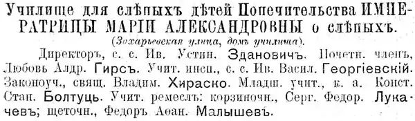 Учебная программа включала Закон Божий, русский язык, арифметику, историю, географию и зоологию. Особое внимание уделялось пению. Чтобы получить дополнительные средства на содержание училища и дать незрячим детям из бедных семей специальность, которая позволила бы им в будущем прокормить себя, воспитанников обучали корзиночному и щеточному производству. Корзины, щётки, а также мебель продавались в особом магазине при училище, порой выполнялись даже частные заказы, что говорит о высоком профессиональном мастерстве[4]. «Почетный член» Любовь Александровна Гирс — супруга губернатора, так Зданович обеспечивал официальную поддержку своего начинания.