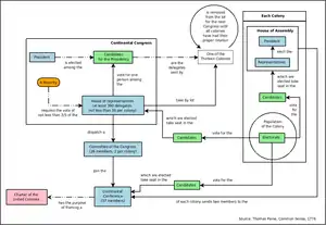 Пейн предположил, что Конгресс может быть создан следующим образом: каждая колония должна быть разделена на округа, и каждый округ «пошлёт в Конгресс должное количество делегатов»[22]. Пейн считал, что каждая колония должна направить в Конгресс не менее 30 делегатов и что общее число делегатов в Конгрессе должно быть не менее 390. Конгресс собирался бы ежегодно и избирал президента. Каждая колония будет участвовать в лотерее; президент будет избираться всем Конгрессом из делегации колонии, выбранной в лотерее. После того, как колония была бы выбрана, она исключалась бы из последующих лотерей до тех пор, пока не будут выбраны все колонии, после чего лотерея начиналась бы заново. Для избрания президента или принятия закона требовалось бы три пятых голосов конгресса.
