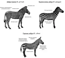 По поводу фоновой окраски зебры часто встречаются две взаимоисключающие позиции: белая либо чёрная. Куратор отдела крупных млекопитающих зоопарка Атланты Лиза Смит (Lisa Smith) утверждает, что специалисты чаще всего описывают зебру как чёрную лошадь в белую полоску[3]. Несмотря на общий признак чёрно-белых полосок, все три вида зебр между собой не являются более близкими родственниками, чем по отношению к другим видам лошадиных. У вымершего подвида равнинной зебры, квагги, полоски ограничивались лишь районом шеи, в то время как некоторые другие, абсолютно неродственные виды, также проявляют склонность к образованию полосок на ногах, например, окапи.