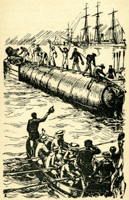 «У снаряда находится шесть петард, заряженных каждая 600 фунтами пороху, да одиннадцать бомб, установленных таким образом, что сам управляющий снарядом, не выходя из него, прикрепляет их к килю неприятельского корабля, посредством механизма, приводимого в действие изнутри снаряда. Прикрепление же происходит без шума или удара, в пятнадцать секунд, в течение которых снаряд, посредством двух крюков, находящихся на передней и задней его частях, так прикрепляется к килю неприятельского корабля, что не отстанет ни при перемене курса корабля, ни от волнения... Снаряд снабжен ракетными поплавками, выбрасывающими от 170 до 300 ракет разом в коническо-спиральном виде; эти поплавки производят страшное действие, но неприятелю их на воде нелегко распознать»[2]