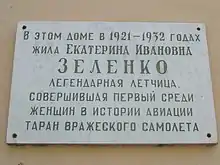 Екатери́на Ива́новна Зеле́нко (14 сентября 1916, село Корощино Овручского уезда Волынской губернии, (ныне Олевский район, Житомирская область)[3]. — 12 сентября 1941, близ села Анастасьевки Сумской области) — советская лётчица, единственная в мире женщина, совершившая воздушный таран, Герой Советского Союза (5.05.1990, посмертно). Старший лейтенант.