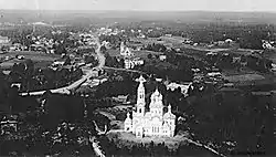 | Первая деревянная Церковь Казанской иконы Божьей Матери. Фото 1900-х годов | Праздник в честь подведения под крышу Лютеранской кирхи Преображения Господня. Фото 1908 года | Фото 1910-х годов | Лютеранская кирха Преображения Господня. Фото 1910-х годов |