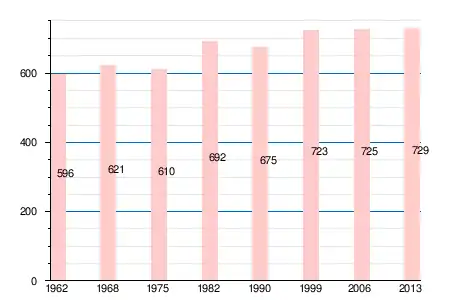 | 1962 | 1968 | 1975 | 1982 | 1990 | 1999 | 2006 | 2008 | 2011 | 2012 | 2013 |