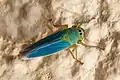 Тело самки рыжеватое. Передние крылья бирюзовые с белой каймой; жилки на передних крыльях окаймлены тонкой чёрной полоской. Голова коричневатая или желтовата, с парой чёрных точек между глазами. Переднеспинка и щиток желтовато-зелёные. Брюшко синевато-чёрное[5]. Самцы похожи на самок, но немного меньше их по размерам. Цвет передних крыльев тоже отличается от их цвета у самок, то есть у самцов передние крылья обычно тёмно-сине-зелёные иногда с пурпурным оттенком, тёмно-сине-зелёные или даже чёрные, редко зелёные[5][8].