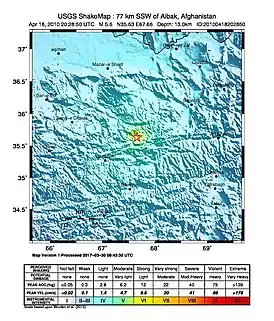 Землетрясение в центральном Афганистане (2010) магнитудой 5,6 произошло 18 апреля 2010 года в 20:28:50 (UTC), в 77,2 км к юго-юго-западу от города Айбак[3].