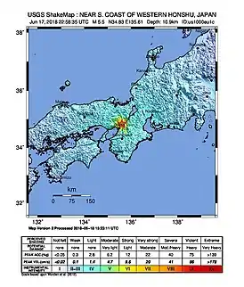 Землетрясение в Осаке (яп. 大阪府北部地震 О:сака-фу Хокубу дзисин) — землетрясение, произошедшее 18 июня 2018 года в северной части префектуры Осаки, Япония. Эпицентр находился на 34.829 градусов северной широты и 135.638 восточной долготы. Магнитуда занимала 6.1 позицию по шкале оценки магнитуды японского метеорологического агентства, а глубина составляла около 13 километров[4]. А само землетрясение заняло 6 место по шкале японского метеорологического агентства[5]. В ходе землетрясения погибло 6 человек, 443 получили ранения.