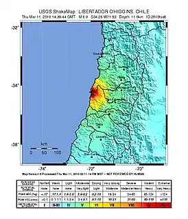 Землетрясение в Пичилему магнитудой в 6.9 произошло 11 марта 2010 года, эпицентр находился в 40 километрах к юго-западу от Пичилему, область Либертадор-Хенераль-Бернардо-О’Хиггинс, Чили[2][3][4]. Тихоокеанский центр предупреждения о цунами заявил об отсутствии угрозы разрушительного цунами, но предупредил о возможности локальных цунами в радиусе 100 километров от эпицентра[5].