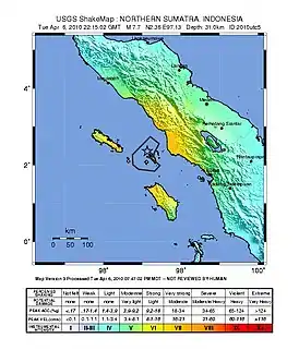 Землетрясение магнитудой 7,8 произошло 6 апреля 2010 года в 22:15:01 (UTC) в районе индонезийских островов Баньяк (провинция Северная Суматра), в 75,1 км к востоку от города Синабанг[3]. Гипоцентр землетрясения располагался на глубине 31,0 километров[1]. Интенсивность землетрясения составила VIII по шкале Меркалли[1].