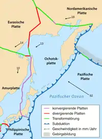Землетрясение произошло в Японском жёлобе — глубоководной океанической впадине, где сталкиваются Тихоокеанская и Охотская литосферные плиты. Более тяжёлая в этом месте океаническая Тихоокеанская плита погружается под материковую Охотскую плиту, над которой располагается часть Евразийского континента и некоторые Японские острова[8][15]. Предполагается, что Охотская плита по своему движению может считаться частью одной из 7 наиболее крупных литосферных плит — Северо-Американской плиты.