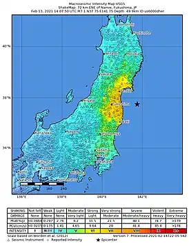 Землетрясение произошло 13 февраля 2021 года в 23:08 по японскому стандартному времени. От землетрясения пострадало более 150 человек[15]. В Токио и пригородах нарушилось электроснабжение — без света остались более 950 тысяч домохозяйств. Атомные электростанции, расположенные в близлежащих районах, в результате землетрясения не пострадали, подчеркнули представители правительства Японии[16]. Однако в стране несколько ТЭС все же приостановили свою работу. Сейсмологи предупредили, что в ближайшую неделю в этом же регионе могут произойти повторные мощные толчки[17].