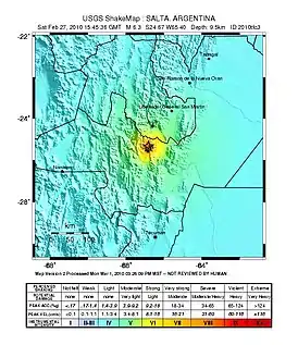 Землетрясение магнитудой 6,3 произошло 27 февраля 2010 года в 15:45:37 (UTC) в аргентинской провинции Сальта, в 5,5 км к северо-востоку от Кампо-Кихано. Гипоцентр землетрясения находился на глубине 10,0 километров[3]. Землетрясение ощущалось в населённых пунктах Аргентины: Кордова, Сальта, Сан-Мигель-де-Тукуман, Сан-Сальвадор-де-Жужуй, Либертадор-Генерал-Сан-Мартин, Мендоса, Сан-Педро, Санта-Фе. Подземные толчки ощущались также в Асунсьон (Парагвай), Антофагаста (Чили), Калама (Чили), Тариха (Боливия)[4].