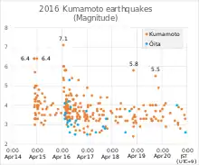 Землетрясения в префектуре Кумамото (яп. 熊本地震) произошли в Японии на острове Кюсю 14—17 апреля 2016 года. Магнитуда землетрясения составила от 6,5 до 7,3 Mw. 273 погибших, 2809 раненых[1][2][3][4]. Первое серьёзное землетрясение в Японии, унёсшее жизни более чем 30 человек с 2011 года.
