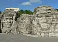 Другую часть мемориала составляют каменные глыбы. На первом, отдельно стоящем камне, высечены слова, давшие название мемориалу: «Землякам-комсомольчанам, павшим в боях за Родину в суровые годы Великой Отечественной войны». Далее — семь каменных лиц, представляющие собирательные образы: пехотинец, танкист, моряк, лётчик, девушка-партизанка, снайпер-нанаец, сын полка. Глыбы сформированы из гранитных блоков. Высота каждой — от 5 до 6 метров.[1][2]