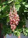 Цветки в конечных повислых или прямостоячих метёлках. Чашечка глубоко пятилопастная, остающаяся при плодах; венчик сростно-лепестный, шаровидно-кувшинчатый, после цветения быстро опадающий, белый или розовый, с пятью завернутыми наружу тупыми зубцами. Тычинок 10, не выступающих из венчика; пыльники с двумя назад отогнутыми придатками, открывающиеся на верхушке отверстиями; тычиночные нити тонковолосистые. Подпестичный диск обычно 16-лопастный. Завязь пятигнездная, с многочисленными семяпочками.