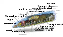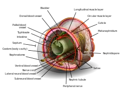 Кровеносная система у червей замкнутая, достаточно хорошо развита, кровь имеет красный цвет. У дождевого червя два главных кровеносных сосуда: спинной, по которому кровь движется от задней части тела к передней, и брюшной, в котором кровь движется от передней части тела к задней. Эти два сосуда связаны кольцевыми сосудами в каждом членике, некоторые из них, называемые «сердцами», могут сокращаться, обеспечивая движение крови. Сосуды разветвляются на мелкие капилляры[4]. Дыхание осуществляется через богатую чувствительными клетками кожу, которая покрыта защитной слизью. Слизь насыщена колоссальным количеством ферментов, которые являются антисептиками. Нервная система дождевых червей состоит из слабо развитого головного мозга (два нервных узла) и брюшной цепочки. Имеют развитую способность к регенерации.