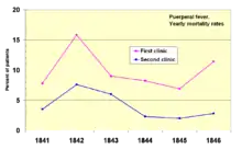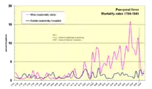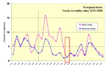 1 июля 1846 года Игнац Земмельвейс был назначен первым ассистентом (старшим ординатором) 1-й клиники Центральной Венской больницы[34]. В первые же дни работы его поразила высокая смертность рожениц от родильной горячки: к тому моменту в клинике Клейна она была выше, чем в любом другом родильном доме всей Европы. Эпидемии уносили жизни почти 20 % (в отдельные годы — свыше 30 %) женщин и новорождённых, при этом смертность в отделении Бартша, где роды принимали акушерки, редко превышала 4 %. Кроме того, в 1-м отделении родильная горячка носила характер эпидемий, а во 2-м если и случалась, то у отдельных пациенток в разных палатах[26]. Этот факт был известен и среди простых венцев: роженицы старались любой ценой избежать попадания в 1-е отделение и стремились попасть к Бартшу, приём в клинике которого начинался после полуночи[35].