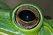 Глаза приспособлены к функционированию в воздушной среде. У земноводных глаза похожи на глаза рыб, однако не имеют серебристой и отражательной оболочек, а также серповидного отростка. Недоразвиты глаза только у протеев. У высших земноводных есть верхние (кожистые) и нижние (прозрачные) подвижные веки. Мигательная перепонка (вместо нижнего века у большей части бесхвостых) выполняет защитную функцию. Слёзные железы отсутствуют, но есть гардерова железа, секрет которой смачивает роговицу и предохраняет её от высыхания. Роговица выпуклая. Хрусталик имеет форму двояковыпуклой линзы, диаметр которой меняется в зависимости от освещения; аккомодация происходит за счёт изменения расстояния хрусталика до сетчатки. У многих развито цветное зрение.