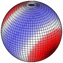Большая из периодических гравитационных сил исходит от Луны. На рисунках изображена приливная сила, создаваемая Луной, для случая, когда Луна находится точно над над 30° с. ш. (на рисунке справа), или 30° ю. ш. (на рисунке слева. Красным цветом показана сила, направленная вверх (от центра Земли), синим цветом — направленная вниз (к центру Земли). На каждой картинке одна красная область находится под Луной, другая от в противоположной точке. Если, например, Если, например, в данный момент времени Луна находится прямо над 30° с. ш. (правый рисунок), 90° з. д., то центр одной красной области находится на 30° с. ш., 90° з. д. (под Луной), центр второй красной области на 30° ю. ш., 90° в. д. (в противоположной от Луны точке), а синеватой полоса является большим кругом, равноудалённым от этих точек. В результате вращения Земли на 30° широты пик силы возникает один раз в сутки, что дает суточный период колебаний силы. На экваторе же возникновение двух равных пиков (и двух впадин) силы соответствует полусуточному периоду колебаний.