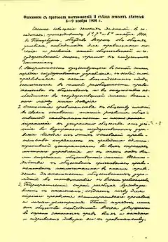 В программе съезда стоящий последним вопрос о власти, об общих условиях, мешающих развитию общественной и государственной жизни, в результате инцидента сразу же возник на собрании. Политическая культура, которой достигли делегаты, позволила в решениях съезда выделить мнение меньшинства по вопросу о полномочиях необходимого России парламента. Оно составило 27 голосов против 71 голоса большинства. Это большинство высказалось за «<…> участие народного представительства, как особого выборного учреждения, в осуществлении законодательной власти, в установлении государственной росписи доходов и расходов и в контроле за законностью действий администрации»[5]. Впервые в России законно заседающее собрание, принадлежащее к земству — выборным от всех сословий, — высказалось в пользу введения конституции и парламента, хотя эти запрещённые слова не употреблялись. Эта резолюция была подписана на собрании 8 ноября на квартире В. Д. Набокова (отца писателя) на Большой Морской, 47.