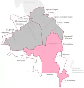 Район включает в себя планировочные районы (бывшие населённые пункты, вошедшие в городскую черту): Зенково, Маганак, Спиченково, Соловьевка, Высокий[18].