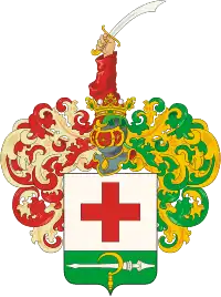 В серебряном щите червлёный греческий крест. В зелёной оконечности щита серебряное копьё, обращённое остриём вправо, поверх него золотой серп, обращённый вправо.