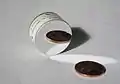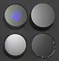 Четыре разных зеркала, показывающие разницу в отражательной способности. По часовой стрелке сверху слева: диэлектрик (80%), алюминий (85%), хром (25%) и улучшенное серебро (99,9%). Все зеркала первой поверхности, кроме хромированного зеркала. Диэлектрическое зеркало отражает жёлтый свет от первой поверхности, но действует как антиотражающее покрытие для фиолетового света, создавая тем самым призрачное отражение лампочки от второй поверхности.