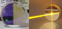 Диэлектрический лазерный выходной ответвитель с отражающей способностью 75–80% в диапазоне 500–600 нм. Слева: зеркало хорошо отражает жёлтый и зелёный, но хорошо пропускает красный и синий. Справа: зеркало пропускает 25% лазерного излучения 589 нм. Поскольку частицы дыма рассеивают больше света, чем отражают, луч кажется намного ярче при отражении назад к наблюдателю.