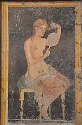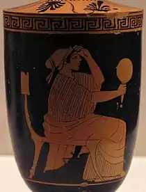 Справа: сидящая женщина, держащая зеркало; древнегреческая аттическая краснофигурная вазопись лекиф художника Сабурова, 470–460 до н. э., Национальный археологический музей (Афины) (Греция)