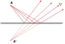 Принцип хода лучей, отражённых от зеркала, прост, если применять законы геометрической оптики, не учитывая волновую природу света. Пусть луч света падает на идеальную плоскую зеркальную поверхность, полностью отражающую весь падающий на него свет, под некоторым углом к нормали (перпендикуляру), проведённой к поверхности в точке падения луча на зеркало[Комм 2]. Тогда отражённый луч будет лежать в плоскости, образованной падающим лучом и нормалью к поверхности, а угол, образованный отражённым лучом и нормалью[Комм 3], будет равен углу падения. Луч, падающий на зеркало под прямым углом к плоскости зеркала, отразится сам в себя.