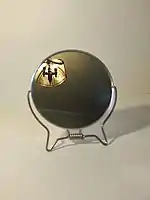 Первое поверхностное зеркало, покрытое алюминием и усиленное диэлектрическими покрытиями. Угол падающего света (представленный как светом в зеркале, так и тенью позади него) совпадает с точным углом отражения (отражённый свет падает на стол).
